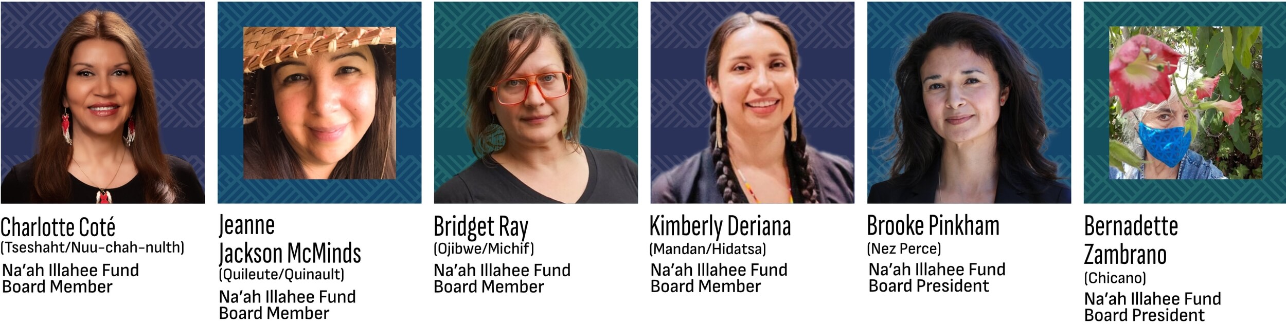 We hold in high honor Na’ah Illahee’s board members: Brooke Pinkham (Nez Perce), Bernadette Zambrano (Chicana), Jeanne Jackson (Quileute/Quinault), Charlotte Coté (Tseshaht/Nuu-chah-nulth), Kimberly Deriana (Mandan/Hidatsa) and Bridget Ray (Ojibwe/Michif). We also honor our past board members for their guidance and wisdom.